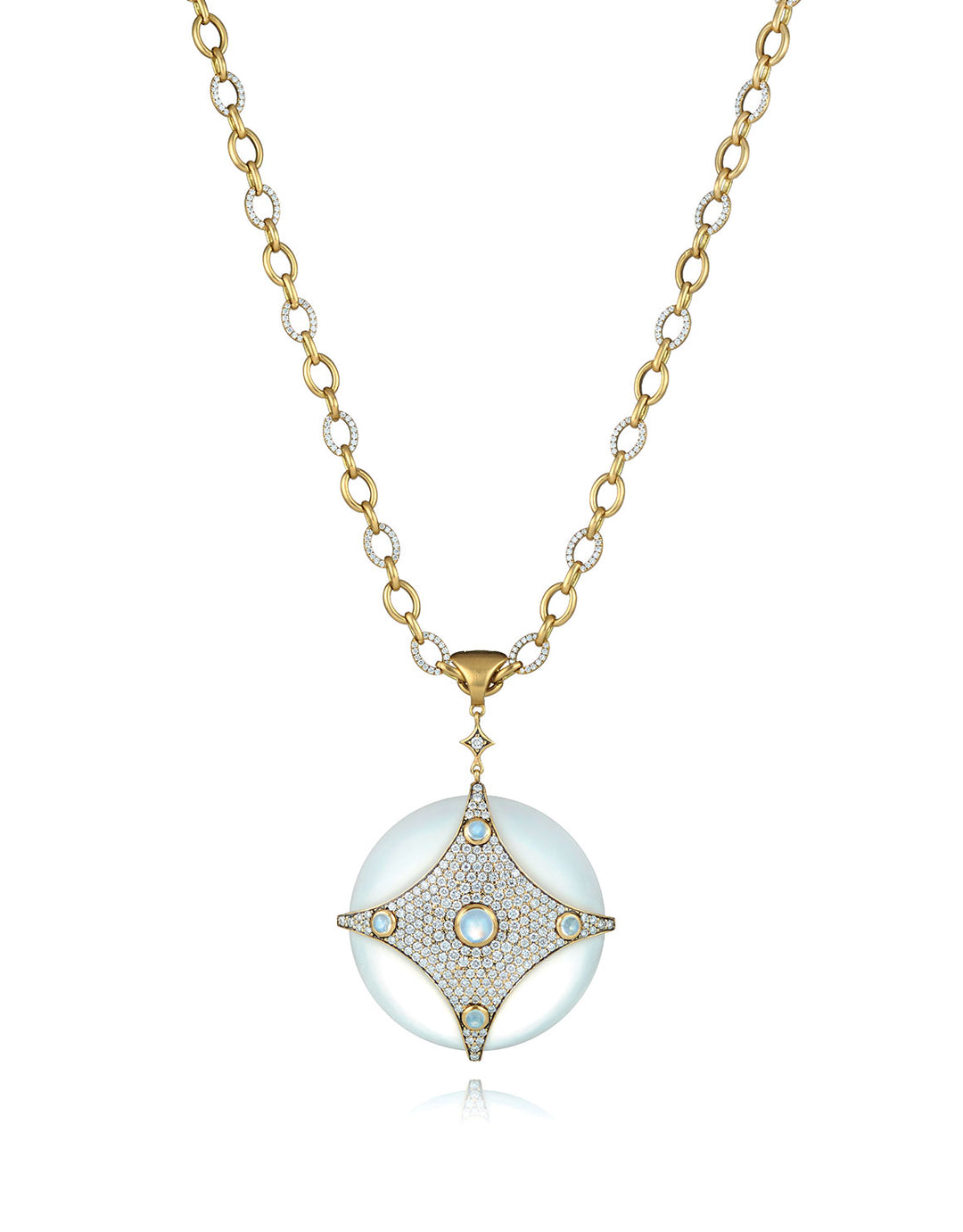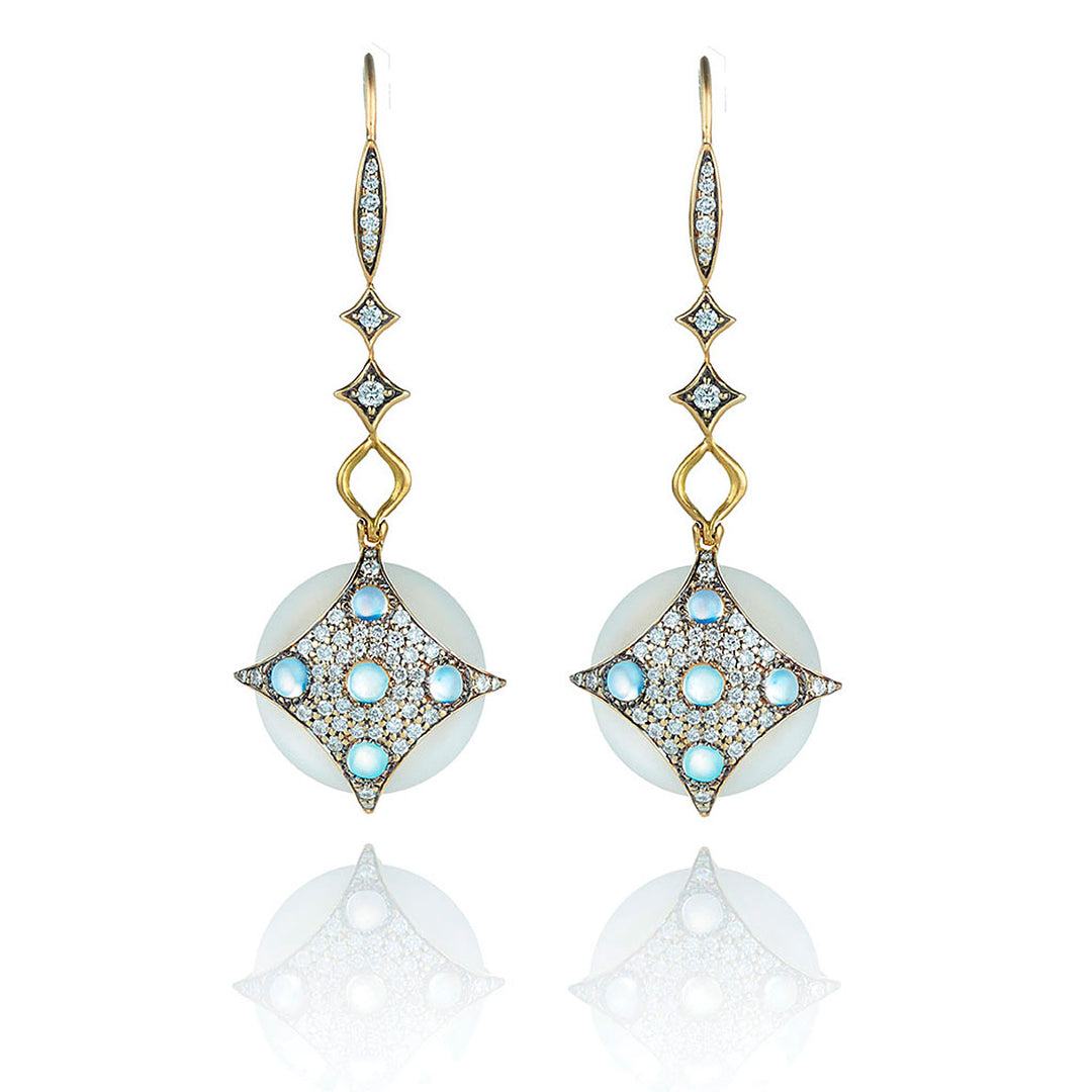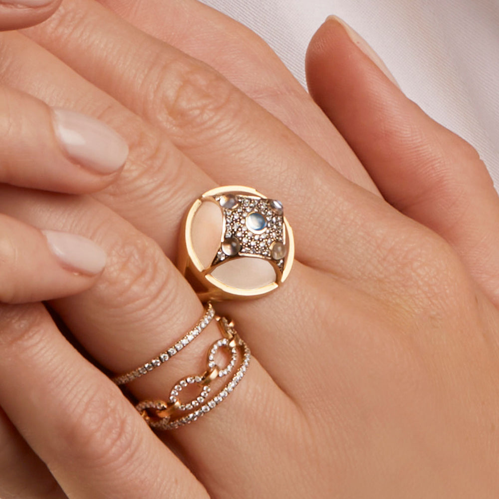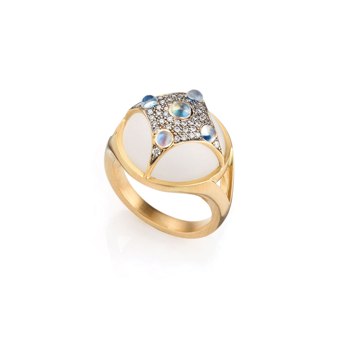 Drawing inspiration from the diverse landscape and the captivating sea ice of the Arctic Circle and its surrounding realm, the Arctic Medallion collection's design is a tribute to the frozen, otherworldly beauty of this region. Infusing elements of frosted topaz, rainbow moonstone, and white diamonds, This harmonious blend of materials and colors creates a luminous, ethereal composition, evoking a profound and understated elegance.